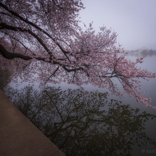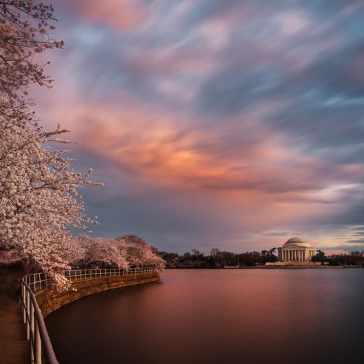 Last evening, storm clouds caught some nice color at sunset. A long exposure streaked the clouds and calmed the water over the Jefferson memorial and still peaking blossoms